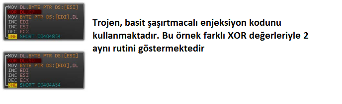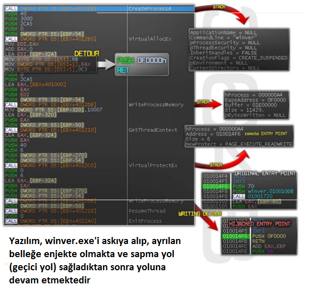 Bu enjeksiyonlar winver.exe ye dahil edilir. Bu dosya system32 dizininde bulunmaktadır. Öncelikle bu kötü niyetli yazılım hali hazır çalışan explorer.exe’e enjekte edilir ya da svchost.exe’nin yeni bir kopyasını başlatır. Bu işlemler kötü niyetli yazılımları kullanıcılar için daha az şüpheli yapanlardan daha farklı bir yol izlemektedir. Bu sayede Virüs uzaktan bağlanma kapsamına girer ve etkilenmiş belleğe kısa bir sapma (geçici yol) yaparak orjinal giriş noktası üzerine yazar. Dosya görüntüsünün kalanı değiştirilmeden kalır.