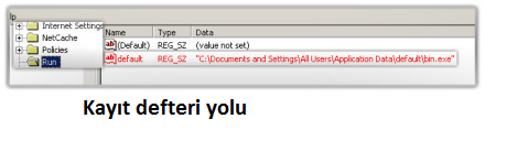 Virüs çalıştırıldığında ntdll.dll, advapi32.dll, ws2_32.dll, and user32.dll kütüphanlerini kullanmakta olduğunu yukarda belirtmiştik. Sistem açılıp kapatıldığında kayıt defterine aşağıdaki gibi bir anahatar eklemektedir.